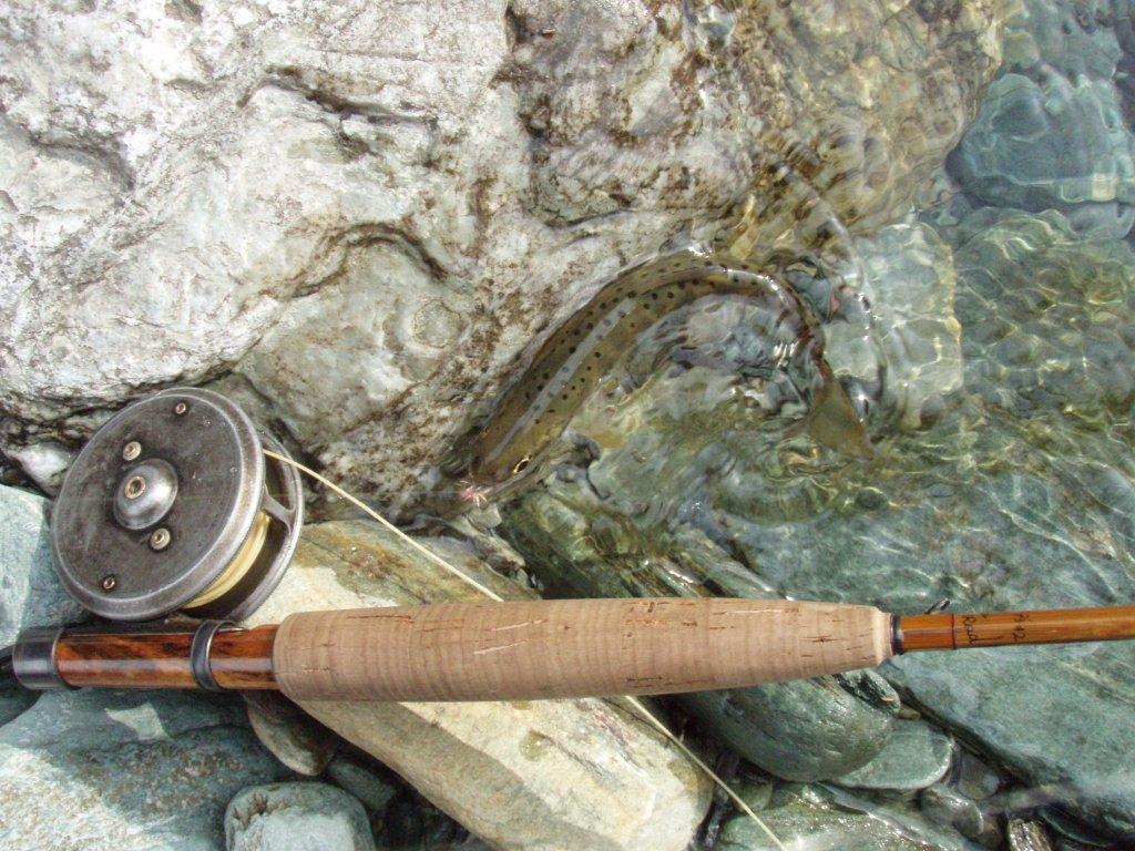 午前中で「猪宴会」の後始末が終了。10年物のラージタープを干して収納しましたが,結構長持ちするもんですね。防水機能がチョット低下したみたいなのでスプレーで復活すればまだ使えそうです。4月以降はセミクローズドのイベントをいくつか企画してます。その為にも「アメゴが釣れなきゃ・・」で,ロッドを持って見回り・水温測定に出かけました。6箇所で測定し,6℃~6.2℃で全てのポイントでライズがありました。26番でライズに見とれてたら岩の上に置いておいた記録板と水温計が風に煽られて (アオラレテ) ,水中に「ズルッ」と・・そのまま行方不明になりました。明日からはデジタル水温計で計測です。小生のデジ水温計は表示が安定するまで時間がかかるので,「なんかなぁー」です。で,チョッコシ落ち込みながら山を降り始めの途中で「気分転換の試し釣り」をしました。当初予定のポイントはズット下で,だったんですが。ウェーディング無しのニーブーツで行ける範囲で各種フライを試し,「やっぱしこれか」のアダムスパラシュート#18でした。片手20cmのアマゴ。一匹釣れたら納竿が最近のマイルールで,有終。2番ロッド・シルクライン・シルクテーパーリーダー・7Xティペットでした。