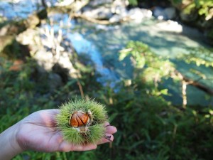 天候にも恵まれ魚の活性も上がってきた今日,午前中は14番から26番までの入・脱渓口の整備と今後の作業予定チェックリスト作りをしました。入渓口表示板の作り直し予定は数か所あり,脱渓口の目印の追加が多くの箇所で必要です。状況の思わしくない箇所から順次処理しようと考えています。24.5番New堰堤上の入渓口サポートロープは付け替えました。クライマーの友人に聞いたら「固定梯子は不安定で,危険性が増すので山では使わないよ」でした。小生としては梯子が欲しい箇所なんですが。25番二本杉の入渓口の看板が紛失していて場所がはっきりとはわかりませんでした。右側の杉の木の側のガードレールの端が入渓ポイントかなと思いますが確実な場所をご存じの方,お知らせ下さい。午後は律子さん(妻です)と大森神社まで散歩しました。途中,ご近所さんから 大きなカボチャを頂き,さっそく夕食はカボチャサラダで美味しく食しました。18番の近くで栗を拾い,一晩水に晒して,「明日は栗御飯」かな?。