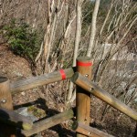 昨日に引き続き入渓された東京から来訪のOさんと見回りの途中で遭遇し,24.5番・新堰堤上に案内し木製階段を下ったところ,倒木に押し潰されたイバラが通路を塞いでいるのを発見。正に「イバラの道」となっていました。Oさんには 25番に回って頂き,いつも車載している鋸 (ノコギリ) でイバラ処理をしました。終わって,最下段まで降りて見たら何と「支柱の根本が先日の大雨で抉られて (エグラレテ) 空中・ブラブラ」状態で木階段も「グラグラ・危~」でした。そこで,上から二つ目の踊り場(?って言うんでしょうか) からの別ルートを作りました(赤テープが目印です) 。手すりを越えてほぼ真横に進むと川まで安全に降りられる場所があります。真横ルートの中央下方には「崩れ」がありますので御注意!!。虎ロープで「道案内」も考えましたが,「そこまでヤルー??」声が何処からともなく聞こえてきて・・保留。抜本的には集落の地区長さんと相談して対応します(色々ありまして・・) 。