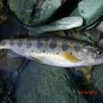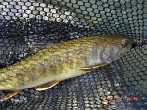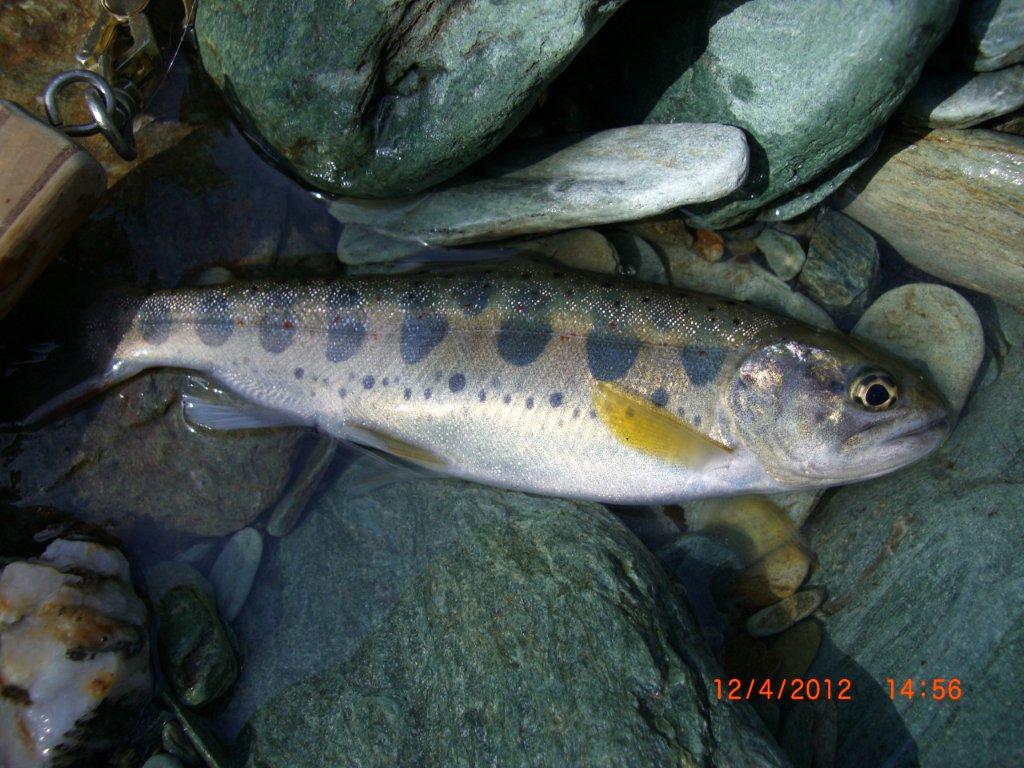 昨日の強雨も今朝はスッキリ上がってました。水位はラッコ岩・足の付け根で平水より10cmアップまで下がり,透明度は「殆んどいつもの状態」で釣り可能。大阪のSさんは上流部へ,昨日は雨の中チビッ子が釣れたそうで本日は「モット・モット」でしょう。午前の水温測定結果は最低が27番・右の谷の8.1℃で,最高は1番・の9.7℃でした。ちなみに,桑瀬川は10.5℃でした。水温は一気に上昇傾向で,それならばと「試し釣り」に出掛けたのです。来週,中野川来訪者の中でおそらく最高齢 (87歳) の方が釣りに来るのでフィールド下見 (足に負担の少ない入・脱渓口の選定,渡渉無しでの釣りポイントの確認,とにかく釣れる場所探し)を。阿寒・十勝北海道を含め,何度か遠征に御一緒してまして,小生は「釣り仲間」と思っているのですが,御当人は「ただの知り合い」と位置付けている可能性有りで,もし中野川川での釣果が思わしく無かったら「お前のせいだ。使えない奴め」てな事になり兼ねないのです (このフレーズの微妙なニュアンスは奥が深いのです)。で,「試し釣り」の結果はと言うと・・「小生にしてはソコソコだけど×,不満足。増水の影響って事で,明日再度」です。桑瀬川で「本日の有効毛鉤」を確認してから中野川川に入渓してまして(ホームグランドで試行錯誤したくないので),魚の付き場所もある程度分かってきたのですが何せ相手は生き物。本日の入渓者さん達に聞いたら「うーん,サイズがね」でした。モウチョイ。