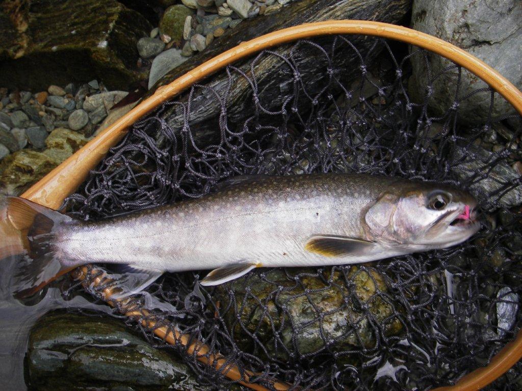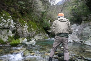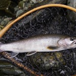 0421’2012_居残り組の東京・Kさんは出発までの午前中,ウェーダー無しで倶楽部ハウス下で大型アマゴを狙いました。魚の活性は相変わらず高いのですがジェット戦闘機のような鋭いチェースで,フライを喰うのが「お下手」なのか「見切っている」のかフッキングは「なかなか」でした。が,推定28cmアマゴがヒット。Kさんは岩上からのキャストだったのでランディングはロッドを受け取った小生が岩を回り込んで水際に立つKさんに手渡す・・と言う方法で。残念,ネットイン直前で「バレ」てしまいました。「リールをもうちょい巻いとけば」と悔やむ小生です。次の一尾は24cmアマゴ。今度は先程の反省を生かして無事ネットイン完了。これでKさんの中野川釣行は終了しました。お疲れ様でした。