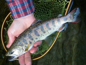 0512’2012 快晴続きで,倶楽部ハウス下のライズも好調です。朝の外気温はまたもや前日より低下して,弱いながらの肌寒風でした。宿泊入渓者さんを送り出した後,見回り・水温測定へ。場所によりアップダウンがあり,桑瀬川11.5℃(前日比-1.4℃)出合橋・中野川川11.5℃(+0.2℃)一番12.9℃(+0.6℃)14番旧堰堤上11.2℃(+0.2℃),旧堰堤から上流は0.3℃から0.5℃の低下でした。それでもハッチ・ライズは頻繁に。旧堰堤上段では尺以上が数尾と尺弱が10数尾クルージングライズしてました。昼食後,ロッドを持って上流へ。本日のロッドは渋谷直人さんの「秋田川連漆塗竹竿KawatsuraROD」7’9” #3 です。いつもは7フィート前後の竿を使ってるので勝手が違い,最初は戸惑いましたがラインスピードが速く多少の風の中でも狙ったポイントに毛鉤を運ぶ事ができました。結果は「マズマズ」で最高は24cmアマゴでした。本日の入渓者さん達も釣果を伸ばし,20cm~24.5cmを何尾かと(これより小型は沢山) 27cmアマゴをキャッチしました。5月8日の26cmアマゴ・5月11日の27cm岩魚も含め,型が出始めてます。