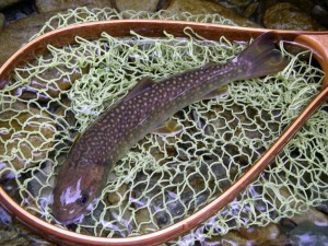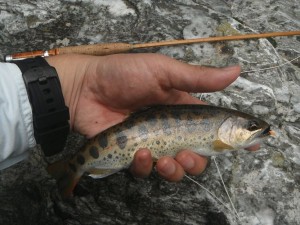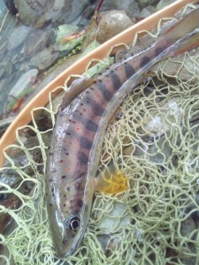 夕刻から雨が降り始めています。水位はラッコ岩・足の下で平水より5cm~10cm程 低下していましたので,若干持ち直すかな?の期待があります。水位が低下したことにより魚の警戒心が増したようで釣果もバラツイテきました。週末は宿泊釣行者が複数で賑やか(ニギヤカ)でした。旧堰堤でかなりの大物をバラした方や釣れ過ぎてなかなか上流に進めなかった方や,反して不釣に難渋した方やイロイロです。毛鉤サイズやティペットの太さ(細さ)もイロイロでして,FFの面白さ・複雑さを垣間見ました。0519’2012晴天時の見回りではアチコチで活発ライズがあり,魚も上を向いて浮かんでましたが,曇天の本日はライズが少なく魚も沈み気味でした。??良く解らない事が多いです。