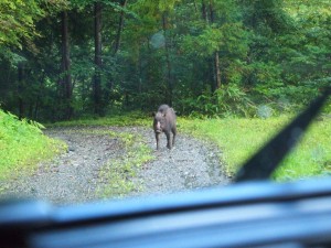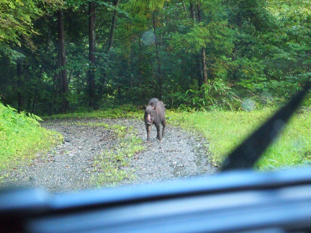 朝から不安定・荒れ気味の天候で,一時は雷・強雨でTVの衛星放送も電波受信不可の状態でした。夕刻には雨上がり・青空で気温も22℃台と過ごし易く,見回りに。魚君達は雷嫌いと見えて浮いている姿は少なかったですが,新堰堤付近では散発ライズをあちこちで発見。帰り道,道に佇んでいる「イの字」と遭遇。クラクションを鳴らすと「トコトコ」歩き始めたり・止まったり・こちらを「ジッと」睨んでみたりしてましたが・・・最終的には山の中へ。夏場は餌がすくないようで,体長に比して胴体廻りはスリムでした。その後,仕事帰りのハンターさんに出会ったので「イの字」遭遇の話をしたら「秋口に木の実を食べて肥えるやろ」と。これまでに何度か猪に出会ってますが,「こちらが動かずに様子を窺っていると反対方向に去る」パターンでした。クラクションやら音を出すのも効果的みたいです。車で出会った時「ぶつけて仕留めてやろう」などとは考えない方が得策でしょう。夜の峠道で鹿にぶつかった事がありますが・・感触は「金属のように固い」ので,車の被害の方が大きいかも。猪の牙はナイフの様に鋭いし。