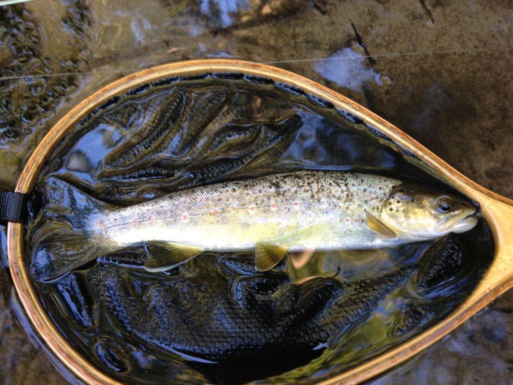 「ミシガン州のPere Marquette Riverで釣りをしてきました。スプリングクリークの川で、全体のうちの一部(といっても8マイルくらいあります)をフライ専用C&Rとしていて、その区間を釣ってきました。地元のショップに話を聞くとかなり大きなスティミュレーターやチェルノブイリアントを勧められたのですが、私のタックルでは大きすぎて上手くキャストできず、結局自分で巻いた一番大きなサイズのイエローサリー8番フックで、この川にしては控えめなサイズのブラウンを釣ってきました。大型化したブラウンが夜にネズミを狙うらしく、マウスのフライで夜釣りするのも大型狙いにはお勧めだそうです。また、秋には遡上するサーモンやスチールヘッドなどをストリーマーやウェットフライで狙うのがお勧めと聞きました。」
