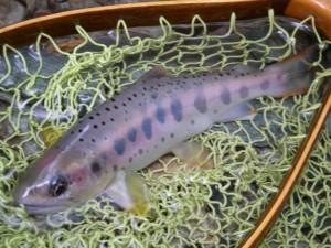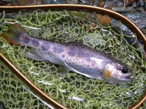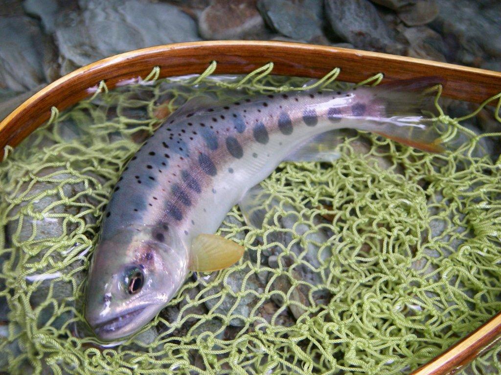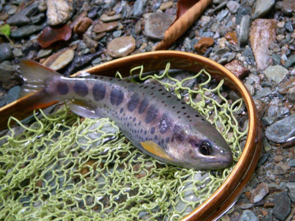 近隣河川に入渓した御二方,師匠とその お弟子さん(Young & Beauty!!) 中野川倶楽部に立ち寄りまして,伺ったお話によると・・ダウンのウェットで彼女の毛鉤にヒットしたのは30cmを優に超える「虹鱒」で「リールは逆転・よう巻けず」でも「頑張った私」。事件は取り込み時に。ネットですくい獲ろうとした師匠・・ネットインできずに・・結果の「バラシ」。イヤー,残念でしたね。初心者の彼女は・「また釣れるさ」的楽観態度。でも,我々は知ってるんです。「何度もあるかな~~??」。お師匠さんは「チョイがっくし」でした。でも彼女の方は大きいのが釣れたことに満足したみたいで・良かったですね。中野川川の釣果はと言えば・・20尾キャッチの方や,源流最奥部まで入渓した方々で・・様々でした。魚の反応は上向いています。魚画像は全て香川から来訪の御二方です。