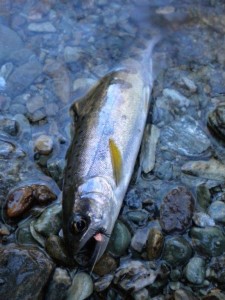 お願い:① 産卵活動中の魚には毛鉤をキャストしないで下さい。いずれにしても,「餌より♀」モードの魚は釣り難いんですが。② 子砂利・中砂利部分で産卵床になっていると考えられる場所 (水底が掘り起こされて・・白っぽくなっている) でのウェーディングは控えて下さい。③