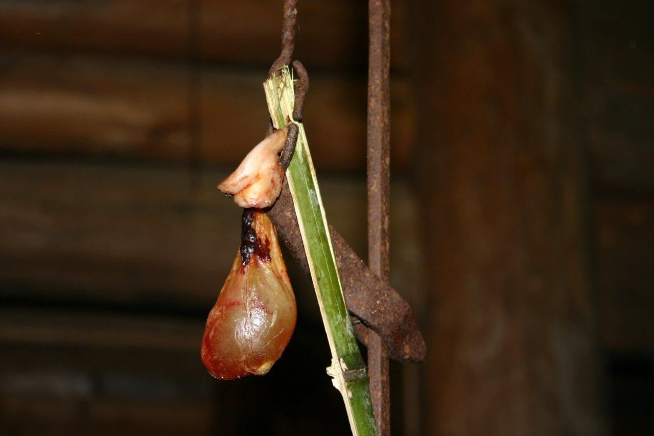昨日は100kg「イの字」をゲットしたハンターさんとの宴会で,ブログは「休み」でした。「きりたんぽ鍋」と高知の「おり酒 (米こうじが原料のにごり酒・甘く飲み易く「ドンドン」でした」と山仕事やら本川神楽 (舞手さんでもあり)やらなんやらの面白い話で温かく楽しいひと時でした。画像は100kg「イの字」の胆嚢です。カチカチになったら少しずつ削って「熊の胆 」と同じように「胃薬」として使うそうです。やはり「すごく苦い」らしいです。猪画像は沢山撮影したのですが,ブログにアップして差支えが無いものは「無い」でしたので胆嚢画像と相成りました(現場は淡々と処理が進み,残酷さとか凄惨さは微塵も無いのですが画像になると何故か「エグイ」のです)。銃弾は脳?頭?に命中していて,「一発」で仕留めてました。大きな鍋は「湯抜き (80℃の湯を掛けて毛をむしり取る) 」用でした、やはり。大きな♂だったので「古傷」がいくつかあり,「自然界でハーレムを維持するのは大変」だなと。(立派な持ち物でしたよ)