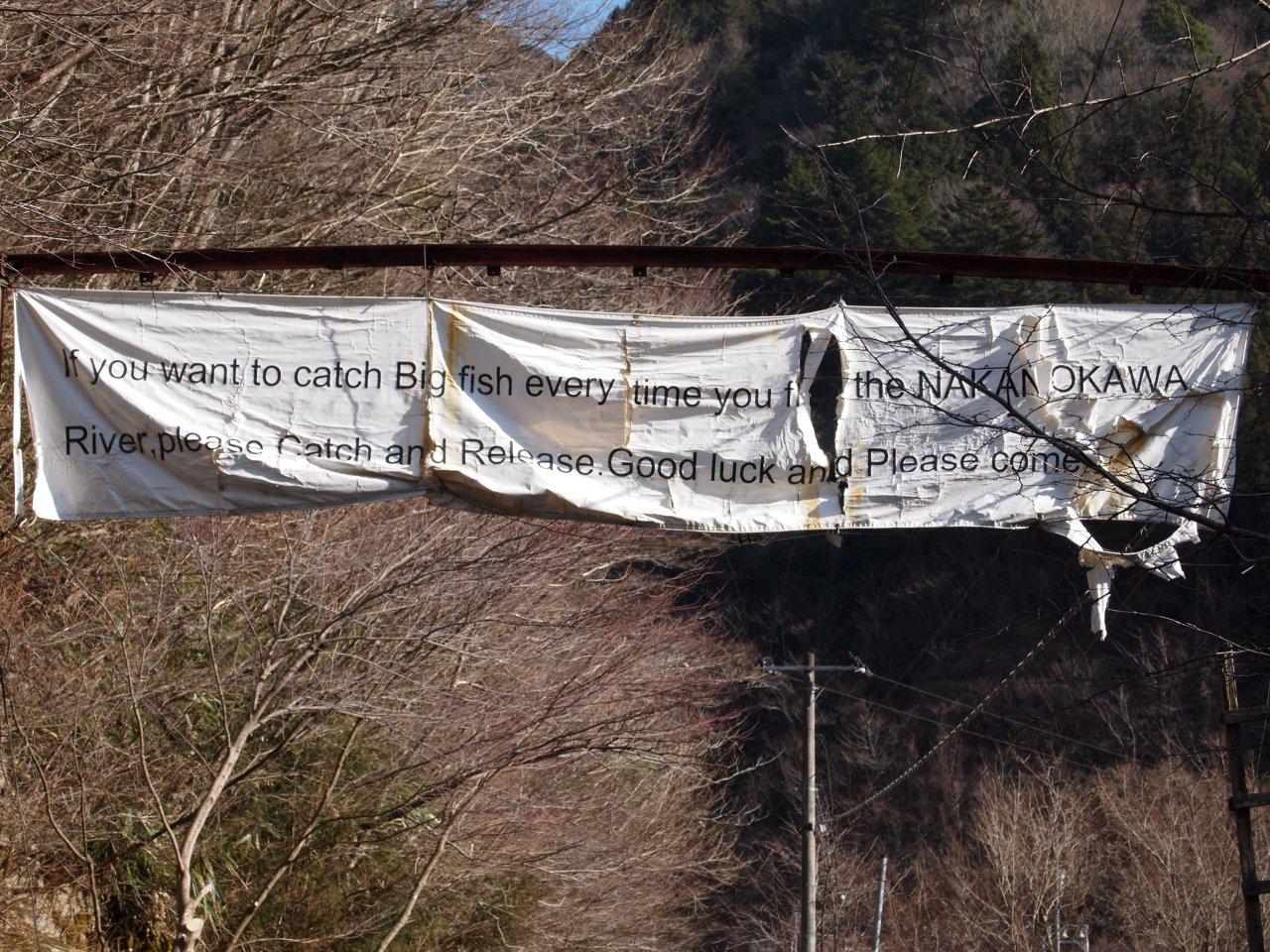 画像は「中野川フライフィッシングエリア」入り口に設置された横断幕の裏側を撮影したものです。お分かりのようにかなり草臥れて (クタビレテ) ます。利用者の皆さんや地域住民からも 「なんとかせ~~」の声があり,本川漁協に相談しましたら「設置したのは 本川漁協なので新しい幕と付け替えたいが予算が足りないので検討する」返答でした。管理を委託されている 「中野川倶楽部」の経営状況は浮上装置が働かない潜水艦ですし。ので,もう少々お待ち下さい (多々かもしれませんが) 。どなたか寄付・寄贈の御意志がございましたら申し出て下さい。